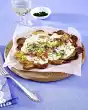 Place baking paper on top and smooth down. Halve the dough. Put 1 half on a baking tray and roll out oval very thin. Spread half of the herb mixture on the bottom and cover with half of the potatoes.