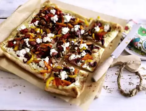 Knead the dough. Roll out to the size of the sheet on the floured work surface. Place the dough on the baking tray and spread with sour cream. Spread oven vegetables on top and sprinkle with rosemary. Crumble the goat's cheese coarsely and spread on the tarte flambée.