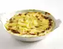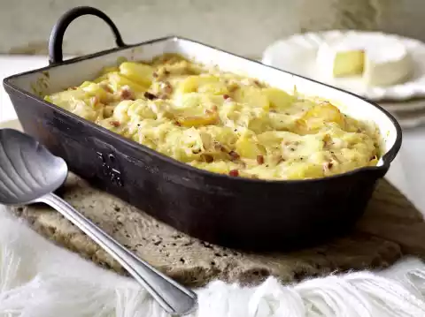 Cut the cheese in half horizontally. Place the halves next to each other with the rind facing down on the potato mixture. Cover the mould with aluminium foil. Bake in the preheated oven (electric cooker: 175 °C/ convection oven: 150 °C/ gas: level 2) for about 20 minutes.