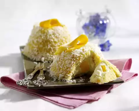 Squeeze the gelatine, dissolve lukewarm. Stir 2 tablespoons of cream into the gelatine. Stir the mixed gelatine into the rest of the cream. Stir in mango puree and small cubes. Chill until it begins to set. Place 4 bowls or cups (10 cm Ø; 250 ml content) on the sponge cake plate and use them to cut out the dough. Line all bowls or cups with sponge cake. Whip the cream with the whisks of the hand mixer until stiff and fold into the cream. Fill bowls with cream and one large mango cube each. Place cut-out cups on top. Chill for at least 3 hours. Turn out the tartufo. Warm up the jam and spread the tartufo and sprinkle with grated coconut. Decorate with remaining mango