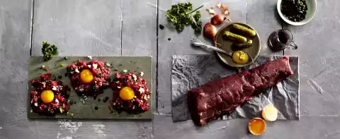 Cut the tartar into quarters and place in heaps on a plate or 4 portion plates. Press a small depression in the middle. Separate eggs, use egg white for other purposes. Put 1 egg yolk in each hollow, sprinkle with some cornichons, shallots, capers, parsley and pepper.