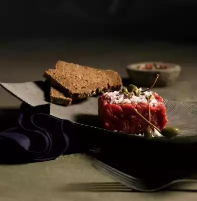 Divide the mince into 4 portions and arrange on plates. Sprinkle with the remaining shallots and capers. Garnish with caper apples. Buttered brown bread tastes good with it.