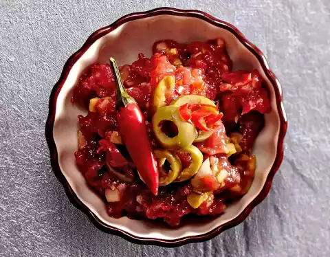 Wash the meat, dab dry, dice, then chop finely. Mix with chilli and ketchup. Season with salt and pepper. Arrange tartar with onion, olive cubes, rings and egg yolk.