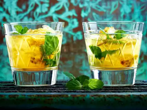 Pour 750 ml of boiling water over the tea bags and leave to infuse for about 5 minutes. Take out bag, add sugar and lime juice and mix. Put tea in a cool place. Cut passion fruit in half and scrape out the marrow. Wash the mint, shake dry and pluck leaves from the stalks