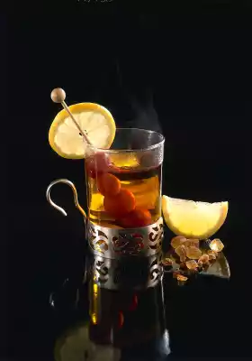 Place tea in a tea strainer, brew with 150 ml of boiling water and leave to steep for 4-5 minutes. Add rum. Put the rum cherries on a stirrer and place them in the glass. Garnish the glass with a slice of lemon.