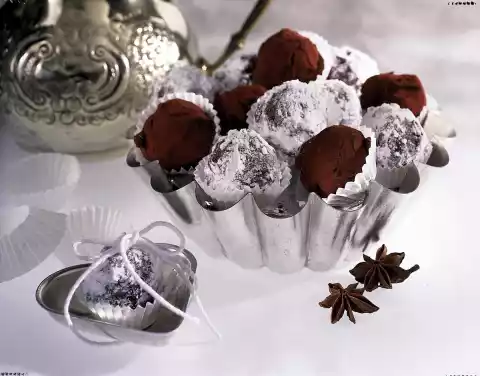 Stir the liquid couverture into the lukewarm mixture and whisk until a homogenous mass is formed. Line a rectangular form (approx. 30x20 cm) with cling film, add the truffle mixture and smooth it down. Let the truffle mixture cool down, cover with foil and leave to set in the fridge for about 24 hours. Turn out the truffle mixture from the mould and remove the foil. Cut the mixture into about 50 pieces of the same size. Shape into balls with your hands and place them on a lightly oiled plate. Refrigerate again for about 1 hour. In the meantime, roughly chop the dark chocolate coating and melt in a hot water bath. Leave to cool, then warm up again briefly. Put icing sugar and cocoa on a plate. Turn the truffle balls with a little liquid chocolate coating in your hands, or dip them briefly into the liquid chocolate coating with a praline fork and let them drip off well. Immediately place them on icing sugar or cocoa and turn them in it.