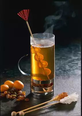Let the raisins in the rum steep for about 30 minutes. Wash and slice the kumquats and put them on a skewer. Bring 1/4 litre of water to the boil. Let tea steep in it. Put rum raisins in a glass and pour the tea on top. Add the kumquat stickers and sweeten with the rock candy stick