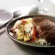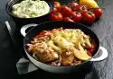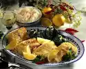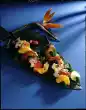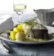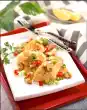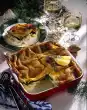 Wash fish, dab dry and cut into large cubes. Sprinkle with lime juice and salt. Turn mushrooms, spring onions and fish in flour one after the other, pull through the dough and fry them floating in hot fat until golden brown. Serve garnished with Asian chives and lime. Serve with soy sauce garnished with horseradish and minced green chili