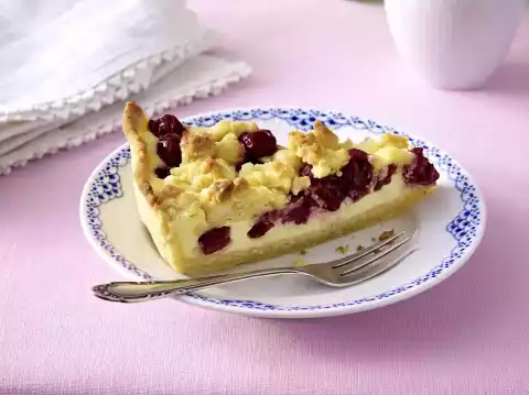 Remove the base, add the curd mixture and cover with cherries. Spread crumbles on top. Bake the cake at the same temperature for 10-15 minutes. Reduce the oven temperature (electric oven: 175 °C/ convection oven: 150 °C/ gas: see manufacturer) and bake the cake in 15-20 minutes