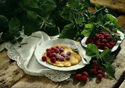 Select the raspberries, wash them carefully and drain them. Separate eggs. Mix egg yolk, milk, flour and salt. Beat egg whites until stiff and fold in carefully. Heat the fat in portions in a pan.