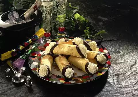 Break the couverture into pieces and melt in a hot water bath. Dip the ends of the rolls into the couverture. Place on a grid and allow to set. Squeeze 1/2 lemon. Whip cream, 2 tablespoons lemon juice and the remaining vanilla sugar until stiff.