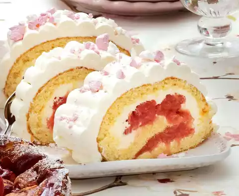 Then fold into the remaining cream. Unroll the sponge cake plate again. Spread with cream, leaving about 2 cm free around the edges. Spread the compote in blobs on top. Roll up the sponge cake and chill for about 4 hours.
