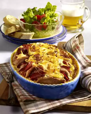 Spread the onions on top and pour the sauce over them. Cook in the preheated oven (electric cooker: 200 °C/ convection oven: 175 °C/ gas: level 3) for approx. 30 minutes. Serve with salad and bread.