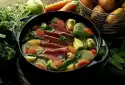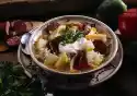 Add 1 litre of water and wine while stirring, bring to the boil once. Stir in broth and thyme. Let simmer for 6-8 minutes. Add bacon, meat, cream and crème fraîche, bring to the boil. Season to taste with salt and pepper. Serve garnished with thyme and parsley
