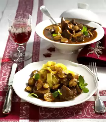 Add approx. 1/4 litre beef stock to the roast and bring to the boil briefly. Pour into the fillet. Wipe out the pan briefly and heat 20 g of clarified butter in it. First fry the shallots, then add the mushrooms and also fry them. Season with salt, pepper and dried marjoram, deglaze with vinegar and 500 ml beef stock. Bring to the boil and simmer covered for 4-5 minutes. Prepare pasta in boiling salted water according to instructions on package. Place the fillet and the extinguished roast in the pan and bring to the boil again briefly. Knead flour and butter, stir into the stock and simmer everything for 2-3 minutes. Lightly whip the cream. Season ragout with salt and pepper and stir in cream briefly.