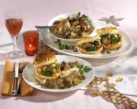 Season the ragout with salt and pepper. Cut a lid off the pies and fill with vegetables. Arrange ragout with rice and vegetable pies on plates. Serve garnished with parsley.