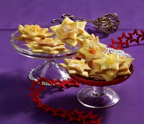 Stir starch with a little water until smooth. Stir into the boiling liquid, simmer for 2-3 minutes. Remove the pot from the heat. Whisk 1 egg yolk and fold into the cream. Spread the cream in patches over the biscuits. Place 2-3 stars of different sizes on top of each other. Sprinkle with blood orange sugar