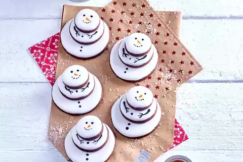 Put the cast aside into a piping bag, cut off a small tip and stick snowman biscuits together with it.