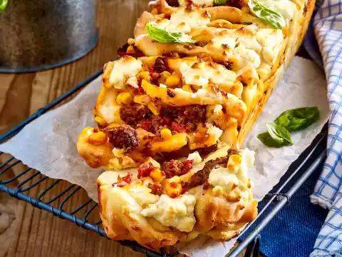 Cut each plate into three equally wide longitudinal strips. Cut the longitudinal strips in half crosswise. Cover half of each dough rectangle with the mince. Fold over free side. Place the box cake tin at a slight angle. Place filled pieces of dough in the tin with the closed side down. Process remaining pieces of dough in the same way and put them into the tin.
