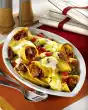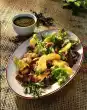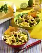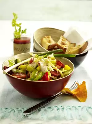 Peel and chop the garlic. Mix tomato juice, garlic, diced spring onion, sugar and vinegar. Season with salt and Tabasco or cayenne pepper and finally stir in about 5 tablespoons of oil. Mix the bell peppers, spring onions, romaine lettuce, tomatoes, avocado and chorizo in a large bowl with the marinade. Roast the baguette for 4-5 minutes under the preheated grill. Serve salad with crème fraîche and cheese. Serve the baguette warm and possibly tortilla chips
