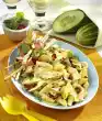 Put a spring onion aside. Dice the bell peppers, cut the spring onions diagonally into rings and the romaine lettuce into strips. Cut tomatoes into quarters. Cut avocados in half, remove seeds and peel the halves. Cut avocados into slices and sprinkle with lemon juice. Finely dice the remaining spring onion. Peel and chop the garlic. Mix tomato juice, garlic, diced spring onion, sugar and vinegar. Season with salt and Tabasco or cayenne pepper and finally stir in about 5 tablespoons of oil. Mix the bell peppers, spring onions, romaine lettuce, tomatoes, avocado and chorizo in a large bowl with the marinade.