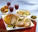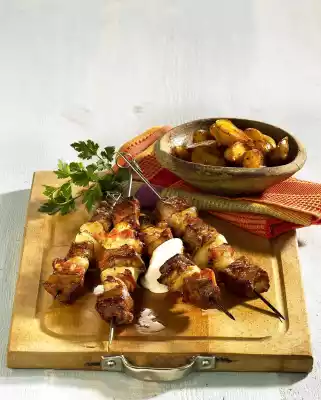 Put meat, bacon and onions alternately on skewers. Slide them over the potatoes on the oven rack. Fry everything else for about 35 minutes. Turn over in the meantime if necessary. Arrange everything. Paprika sour cream and colourful salad go well with it