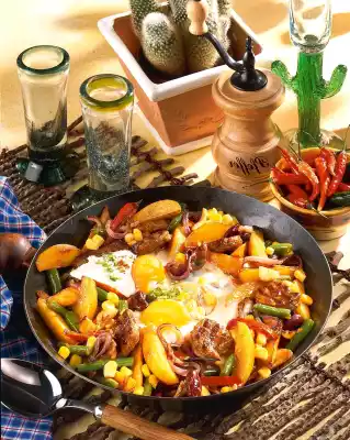 Washing chilies. Add the chillies and 2/3 of the contents of the bag of "Steakhouse Pan" (the rest of the mixture is to be frozen again immediately) to the onion mixture and fry over medium heat for about 6 minutes, turning occasionally.