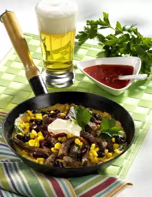 Wash the fillet, dab dry and cut into strips. Rinse the corn with kidney beans and drain. Wash parsley, pluck leaves and chop roughly. Whisk egg and cream.