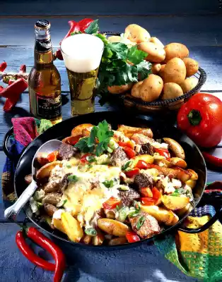 Clean, wash and cut the peppers into pieces. Add the onions and peppers to the potatoes 5 minutes before the end of the frying time and fry with them. Season with salt, pepper and chilli powder. Add the meat to the potatoes shortly before the end of the cooking time and mix in.