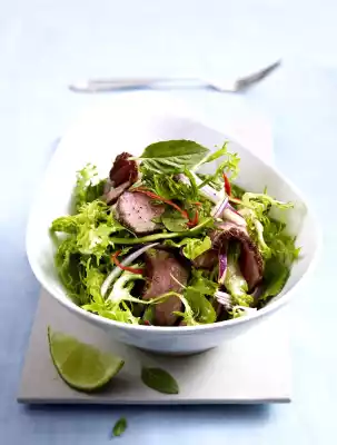 Mix soy sauce and lime juice. Fold in sesame oil drop by drop. Season to taste with salt, pepper and sugar. Cut meat into thin slices and mix with salad, chilli, onions, herbs and dressing.