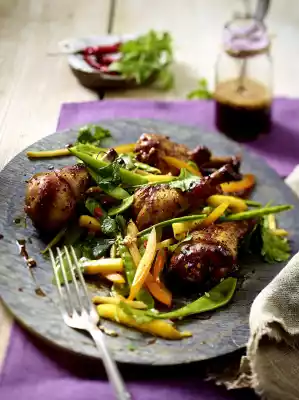 Mix together the paprika, mango, coriander, mint, chilli and sesame. Season salad with soy sauce and pepper. Remove the lower legs from the oven. Serve with salad on plates.