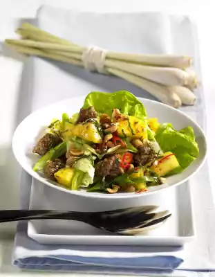 Pour the lemongrass vinaigrette through a sieve, mix everything, let it cool down. Quarter the pineapple and cut out the stalk. Peel quarter and cut into pieces. Clean and wash the salad, pluck into small pieces and drain.