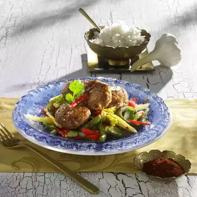 Arrange the meatballs on the vegetables and garnish with the chillies and coriander. Serve with rice.