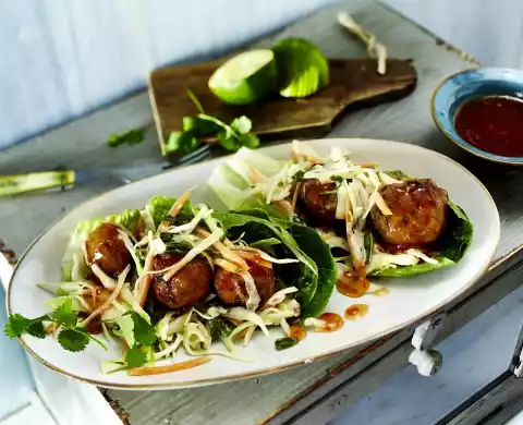 Place 2 lettuce leaves inside each other, fill with some Coleslaw and 3 meatballs each. Add the rest of Coleslaw.