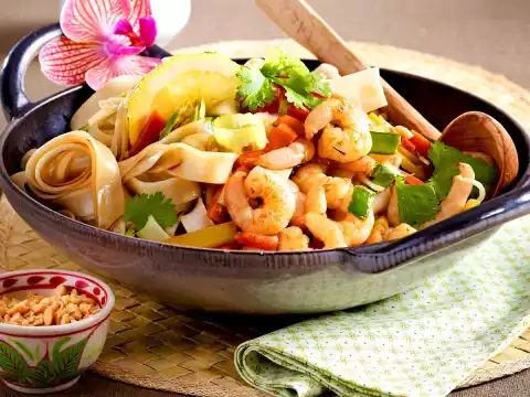 Wash the coriander, shake dry. Peel and chop the leaves, except for a little to garnish. Mix the noodles, prawns and coriander with the vegetables, bring to the boil again, season with soy sauce, lemon juice and a little sugar. Cut the remaining half lemon into slices. Arrange everything, sprinkle with nuts, garnish with coriander and lemon wedges
