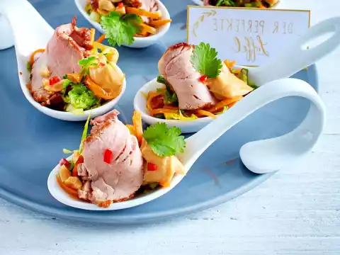 Spread the salad on a spoon. Cut the meat into about 30 very thin slices. Put one slice of meat on each spoon. Put a small blob of dip on each, sprinkle with chilli and garnish with coriander.