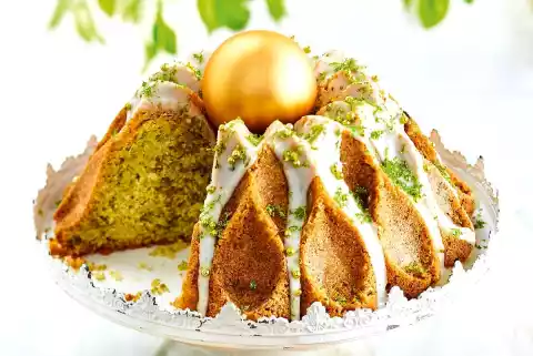 Cream butter, sugar, vanilla sugar and 1 pinch of salt with the whisk of the mixer. Stir in the eggs one by one. Mix flour and baking powder. Add the pistachio mixture, zucchini and the zest of 1 lime. Spread the dough into a greased, flour-dusted ring cake tin (2.5 l capacity).