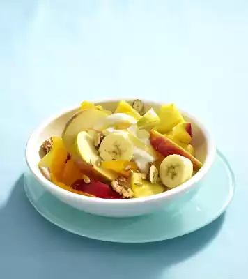 Wash and quarter apples and pears, remove core. Cut fruit into slices. Peel and slice banana. Mix fruit carefully. Arrange in bowls, spread nut mixture on top. Put 2 tablespoons yoghurt and 1 teaspoon honey in each bowl