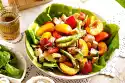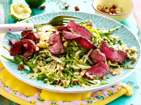 Mix the sugar snap peas with kohlrabi shavings, chives and dressing. Cut the meat into slices. Arrange salad and meat, sprinkle with almonds.