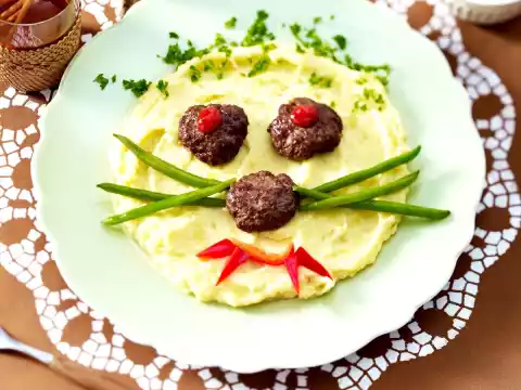 Drain the beans. Pour 1 tablespoon of butter over the hot beans. Then spread the puree as a lion face on 4 flat plates. Place the meatballs as nose and eyes, the pepper strips as mouth on top and some beans as whiskers on the nose.