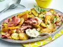 In the meantime cut the potatoes into slices. Fry the bacon in the pan in hot frying fat until crispy, remove. Heat clarified butter in the pan and fry the potatoes for 10-15 minutes until golden brown.