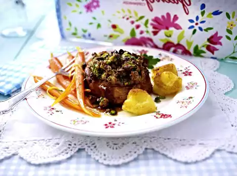 Season with salt and pepper. Place on the baking tray. Spread the bread-pistachio mixture evenly over the meat. Bake in a hot oven for about 15 minutes.