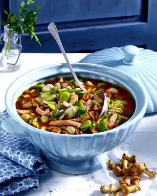 Sauté the mushrooms in hot frying fat, season with salt and pepper and remove. Stir the tomato paste into the frying fat and sweat it on. Add stock while stirring, bring to the boil. Add leek and cook for about 8 minutes.