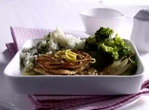 Remove meat from the pan and keep warm. Add 50 ml stock and lemon juice. Bring to the boil and season to taste with salt, pepper and sugar. Arrange meat, rice and broccoli on plates.