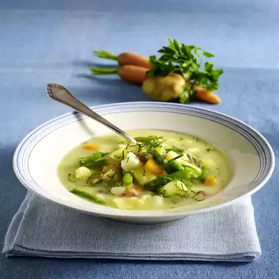 Peel and finely chop the onion. Wash, peel and dice carrots, celery and potatoes. Heat oil in a pot. Sauté potatoes, onion, celery and carrots for 1-2 minutes, then deglaze with broth and milk.