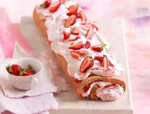 Roll up the sponge cake using the cloth. Place the roll on a plate and spread the rest of the cream loosely. Decorate with remaining strawberries. Chill briefly until serving.