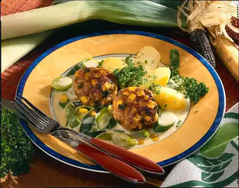 Peel and finely chop the onion. Mix tartar, corn, egg and onion. Season to taste with salt and pepper. Form 2 meatballs from it. Fry in hot oil while turning for about 10 minutes. In the meantime clean and wash the leek and cut into thin rings.