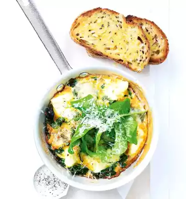 Heat the butter in a large ovenproof pan. Add the garlic and dripping wet spinach and let it collapse briefly while turning. Season with salt, pepper and nutmeg.