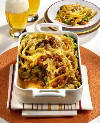 Dust with flour, sauté briefly and add 1/2 litre of water. Add tomato paste, cream and marjoram, bring to the boil while stirring and simmer for 4-5 minutes. Season meat sauce with pepper ( NO SALT ). Lay the macaroni, meat sauce and savoy cabbage alternately in an ovenproof dish. Sprinkle with cheese. Bake in a preheated oven (electric cooker: 200 °C/ convection oven: 175 °C/ gas: level 3) for 30-40 minutes
