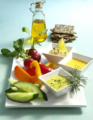 If the mixture threatens to curdle, add 1-2 teaspoons of water. Season the mayonnaise with salt and pepper and cut it into thirds. Leave 1/3 pure and put it into a small bowl. Mix 1/3 with the chopped herbs and egg white cubes, season to taste with salt and pepper. Puree drained tuna, 1 tablespoon lemon juice, half of the capers and 2-3 tablespoons of the last mayonnaise third in a tall mixing bowl. Stir into the remaining mayonnaise together with the remaining capers and diced shallots and season to taste with salt and pepper. Place the tuna and herb mayonnaise in small bowls and garnish with lemon and herbs. Serve vegetables and crispbread with the dips